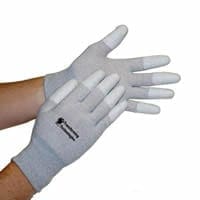ESD inspection gloves are designed to be worn when handling ESD susceptible items when cleanliness and tactile feel are important. The gloves are made with dissipative (10⁵ – 10₈) conductive fibers to reduce charge generation. Available with polyurethane coated finger tips or palms to minimize fingerprints and scratches on film or other products. Sizes: X-Small, Small, Medium, X-Large and 2X-Large.
