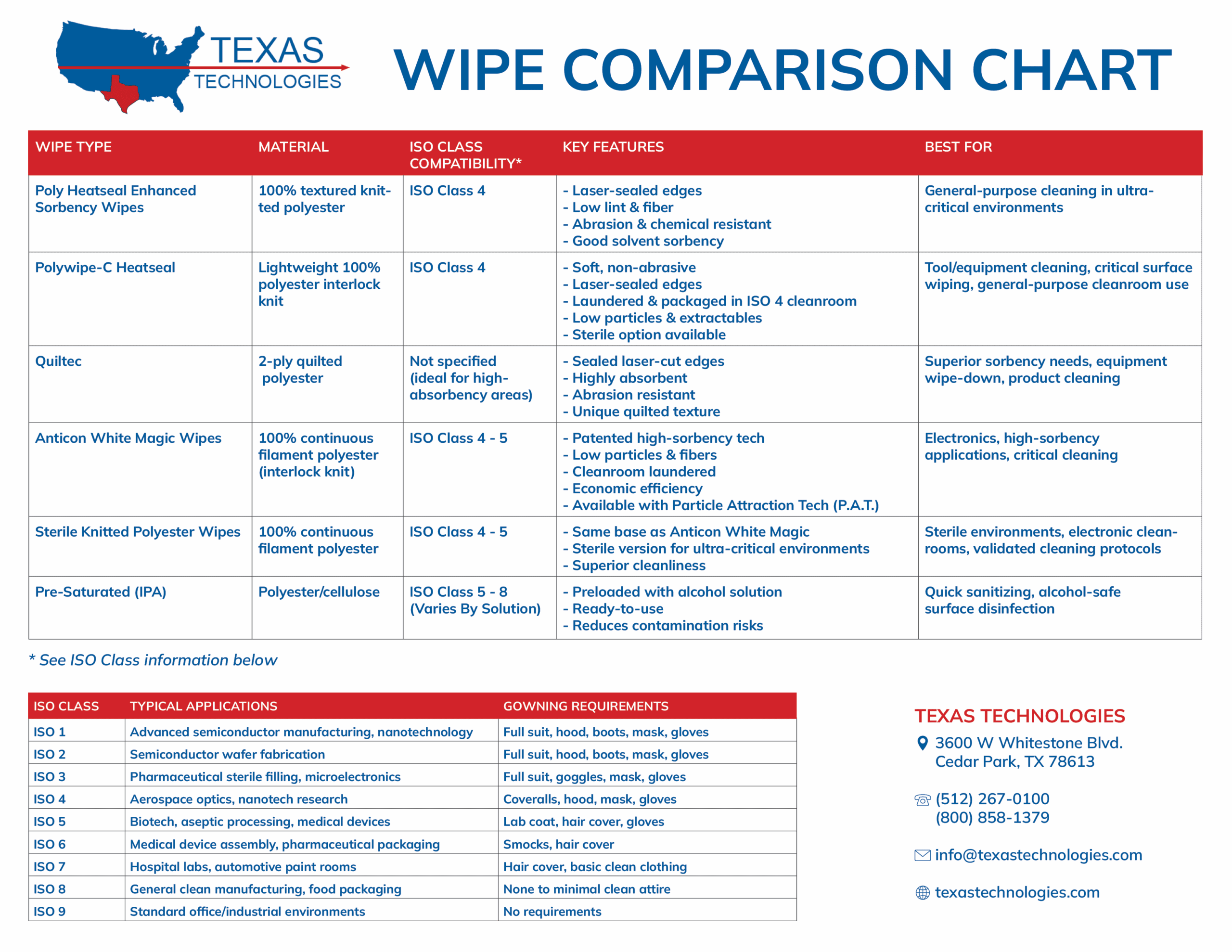 Choosing the best wipe depends on your cleanroom class, specific cleaning task, and whether sterility or solvent compatibility is required. Texas Technologies is here to help you match the right product to your process.