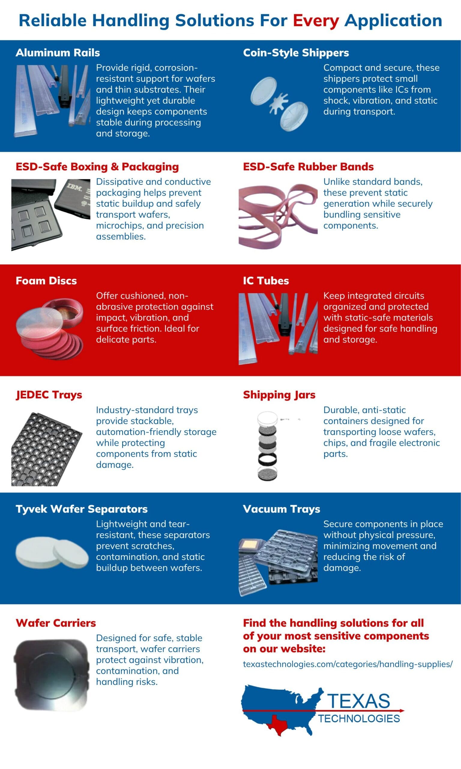 Whether you’re handling wafers, microchips, or high-value electronic components, Texas Technologies provides the ESD protection solutions you need to keep your operations running smoothly.