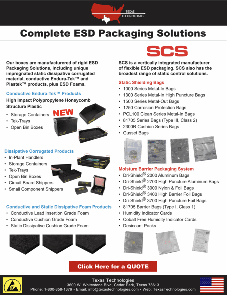 Sometimes you need more than just ESD bags! Texas Technologies has you covered with a variety of packaging solutions for your ESD needs. Contact us today for a quote.
